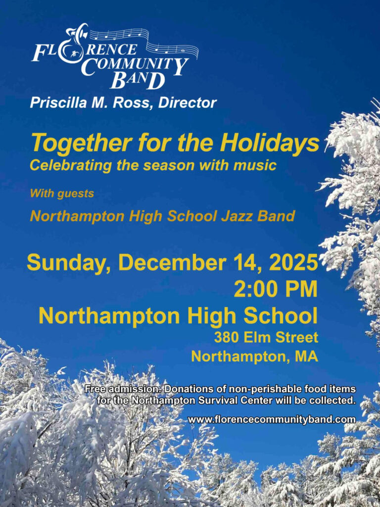 The concert is on December 14, 2025, and begins at 2pm. Admission is free, and donations of a non-perishable food items for the Northampton Survival Center will be collected.