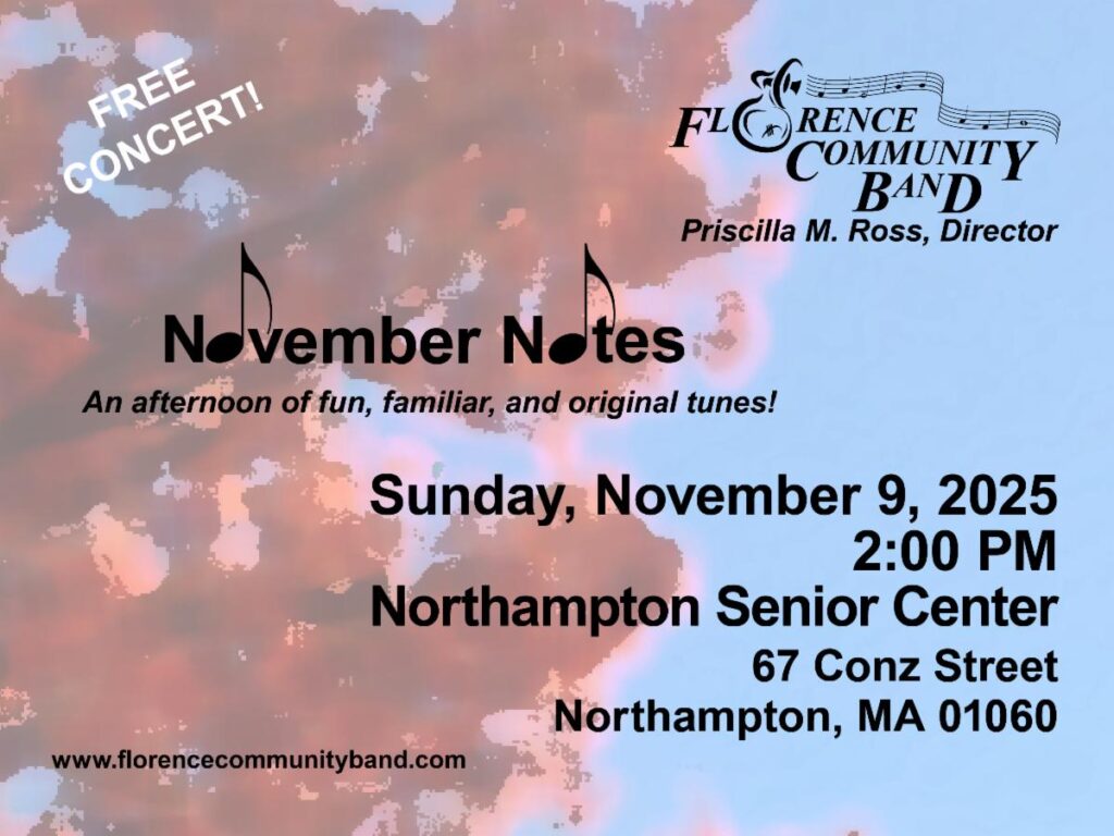 The concert is on Sunday, November, 2025, and begins at 2pm. Admission is free! Located at the Northampton Senior Center, 67 Conz Street, Northampton MA 01060